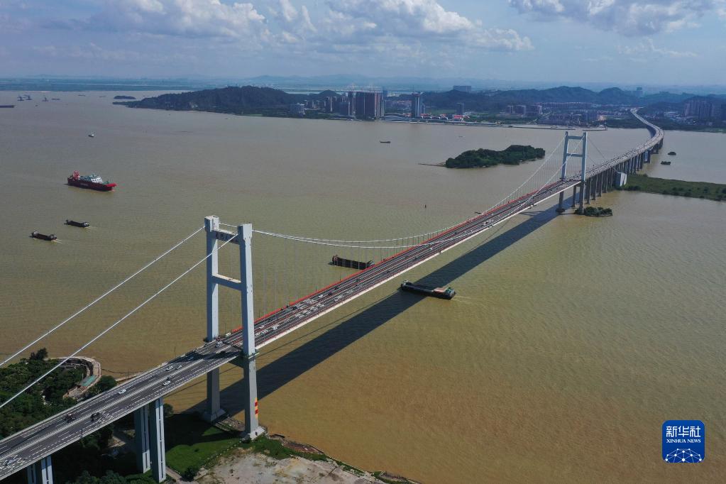 虎門大橋全景(2020年6月23日攝,無人機照片)?;㈤T大橋橫跨珠江口獅子洋水道,連接廣州市南沙區與東莞市虎門鎮。