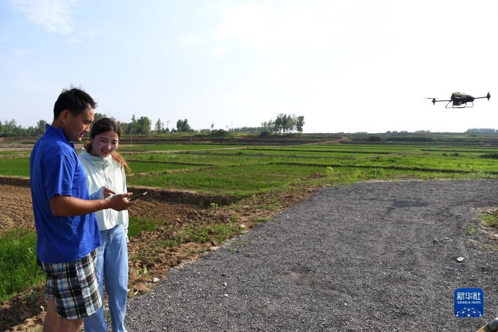 6月29日,胡盼盼(右)在家庭農場和同事一起用植保無人機進行除草作業。