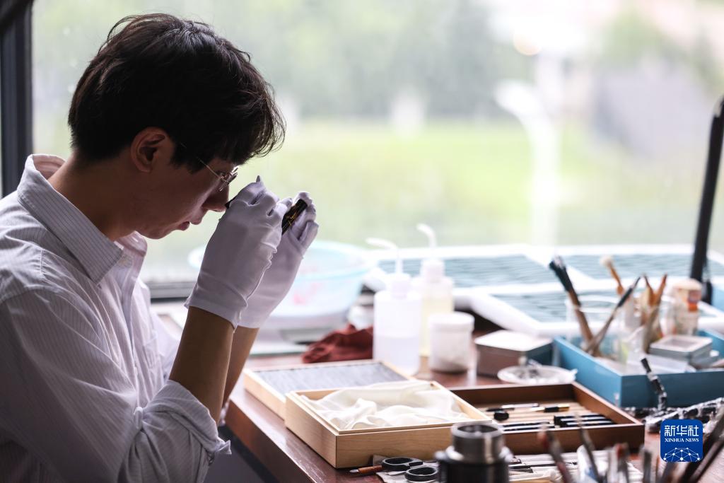 7月1日,袁建在位于貴州大學國家大學科技園的工作室用放大鏡查看鋼筆的筆殼成品。