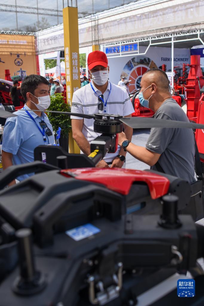 7月3日,在2022新疆農業機械博覽會上,與會者了解植保無人機。