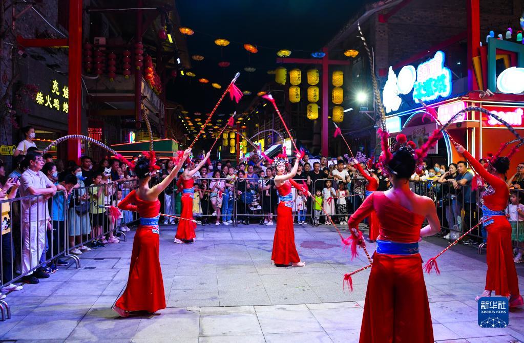 游客在重慶陶然居大觀園新國潮坊觀看文藝表演(6月1日攝)。