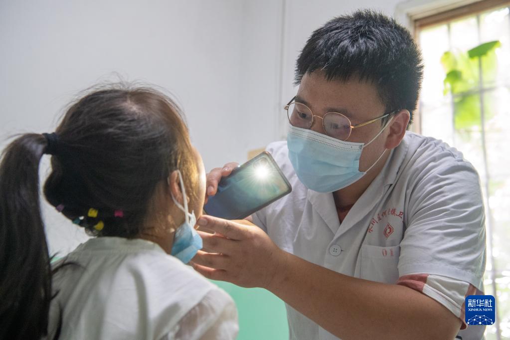 7月1日,村醫胡嘯(右)在玉寶村衛生室為村民做檢查。