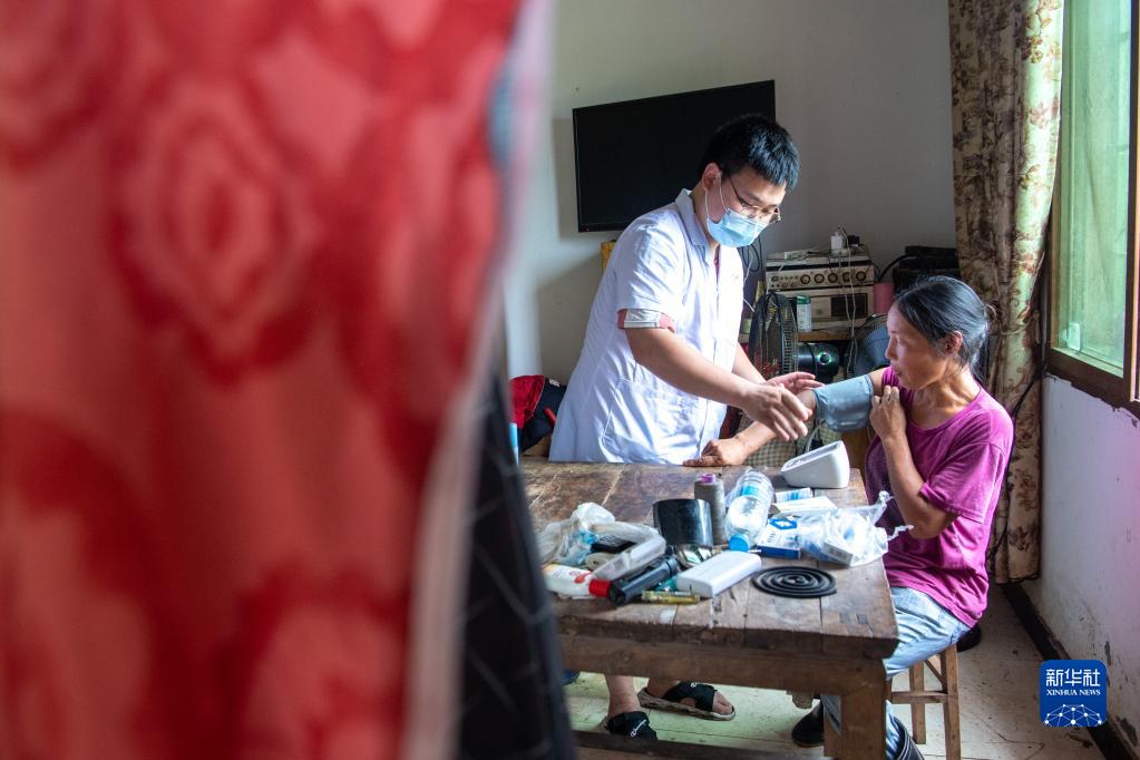 7月1日,村醫胡嘯(左)在一名村民家中為她做診療。