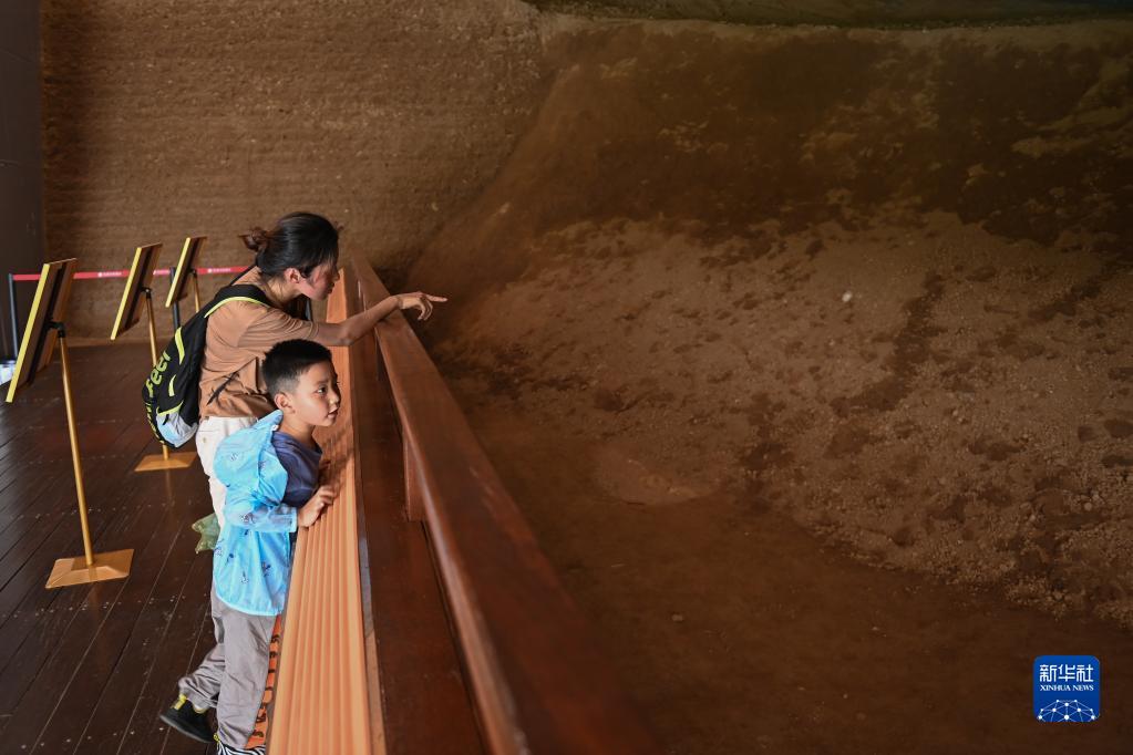 7月6日,觀眾在老虎嶺水壩遺址展示館內參觀沙袋覆土回填保護區。