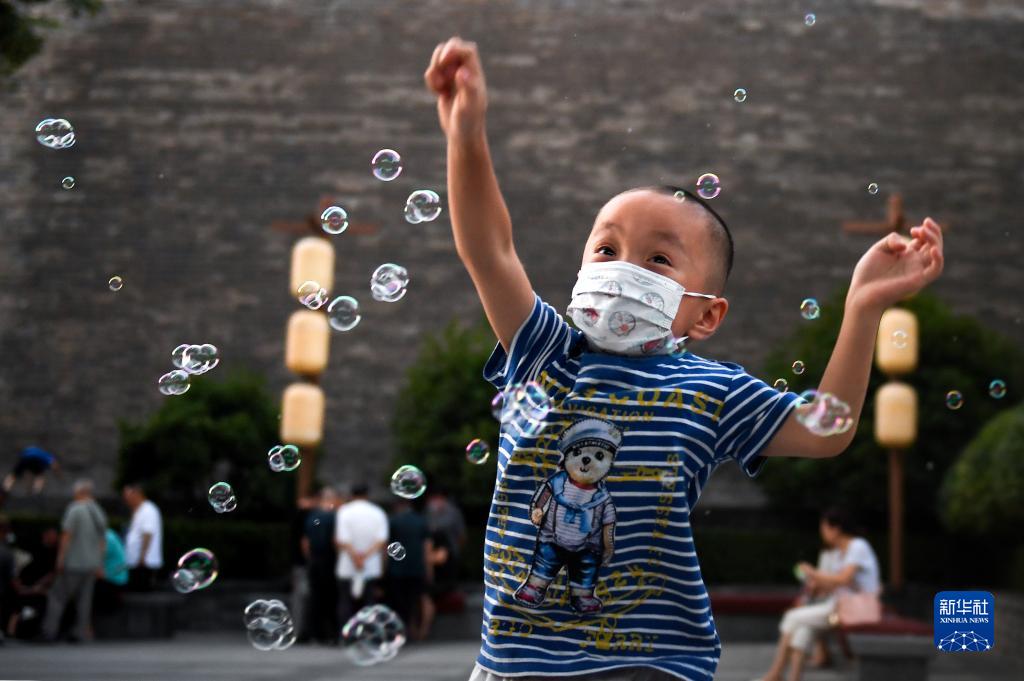 7月6日傍晚時分,小朋友在西安環城公園玩耍。