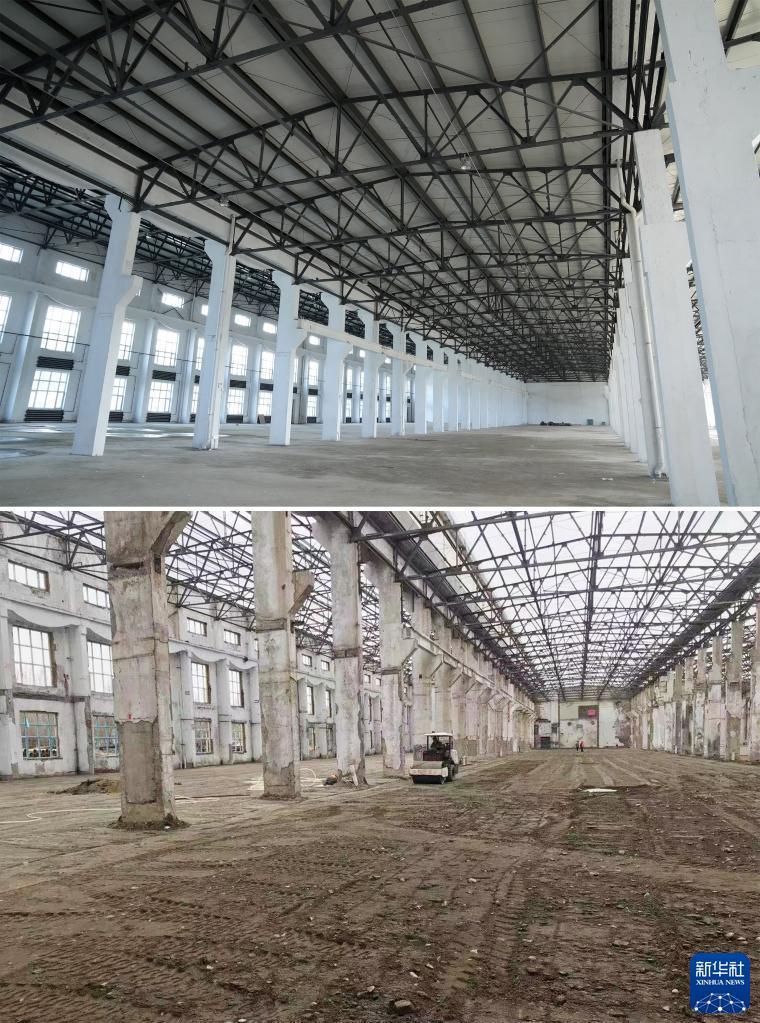 拼版照片:上圖是7月6日拍攝的老廠區一處閑置廢舊廠房改造成的VC·產業園一處廠房(新華社記者王建威攝);下圖是正在改造中的該閑置廢舊廠房(資料照片)。新華社發