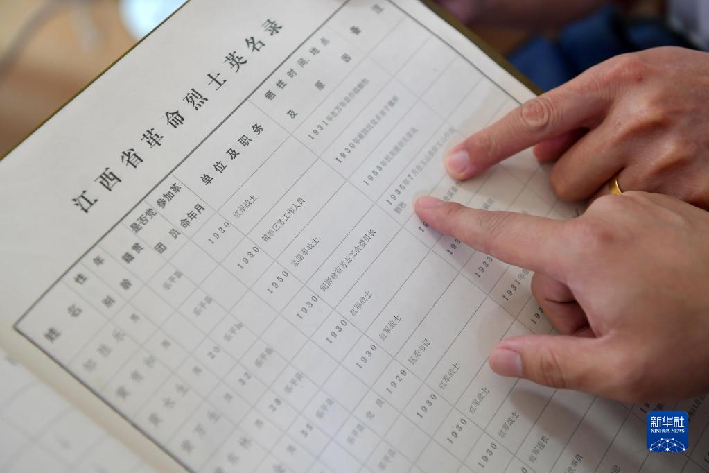 在江西省樂平市退役軍人事務局,程雪清和工作人員在江西革命烈士英名錄上查找他要尋找的烈士(7月6日攝)。
