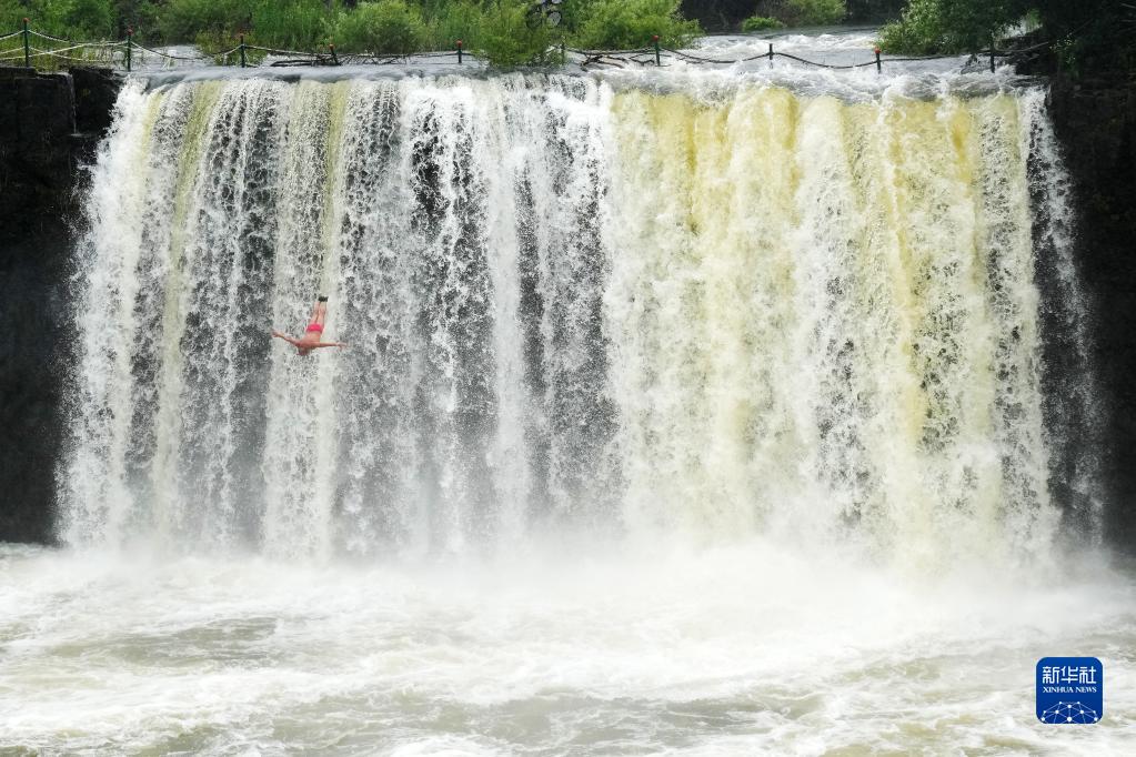 7月15日,一位跳水表演者從鏡泊湖世界地質公園內的吊水樓瀑布上一躍而下。