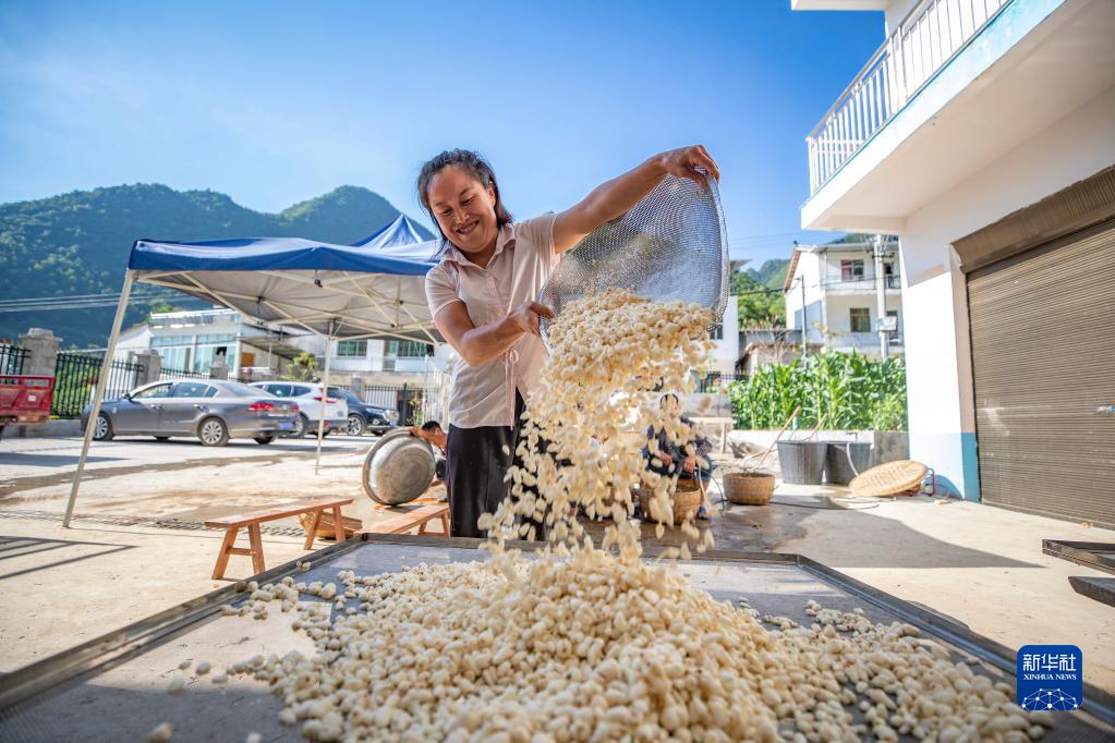 7月14日,在重慶市巫溪縣蘭英鄉西安村,村民將貝母倒入烘干托盤。