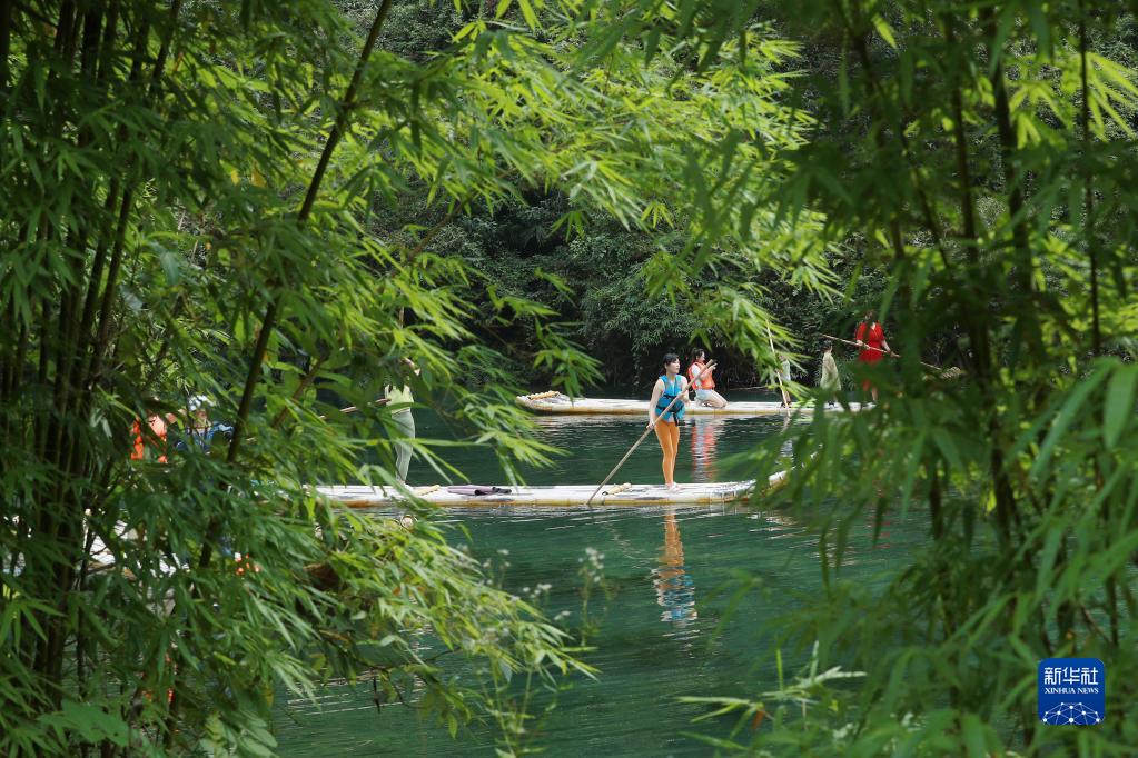 7月16日,游客在湖北省宜昌市秭歸縣三峽竹海生態景區體驗竹筏親水項目。
