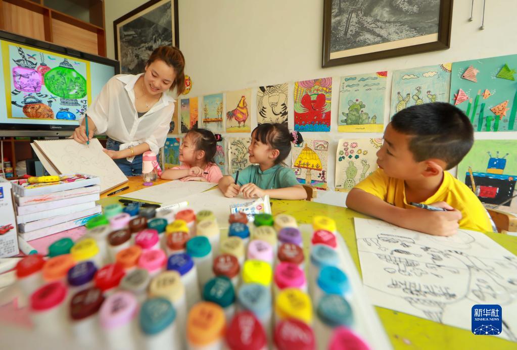 7月17日,學生在貴州省岑鞏縣一家美術培訓學校學畫畫。