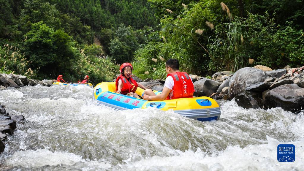 7月17日,在位于湖南省常寧市的天堂山國家森林公園,孩子在家長的陪伴下體驗水上漂流。
