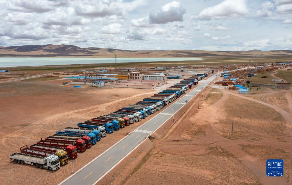 運輸家具的貨車在雙湖縣多瑪鄉果根擦曲村集合(7月12日攝,無人機照片)。