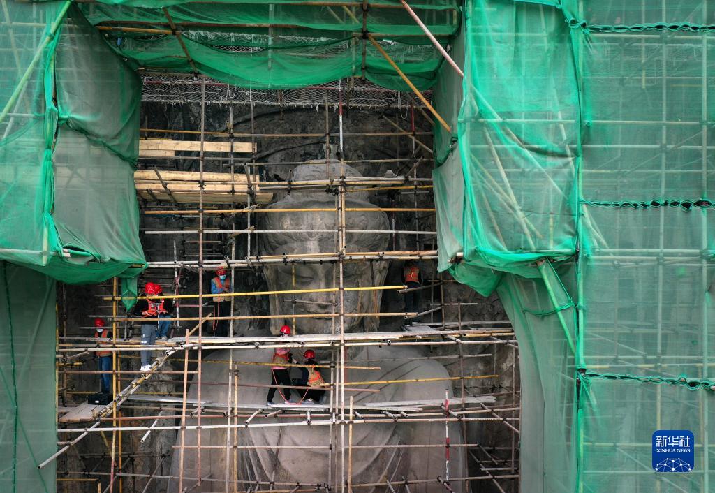 工作人員在洛陽龍門石窟奉先寺進行病害調查評估(4月14日攝,無人機照片)。 新華社記者 李安 攝