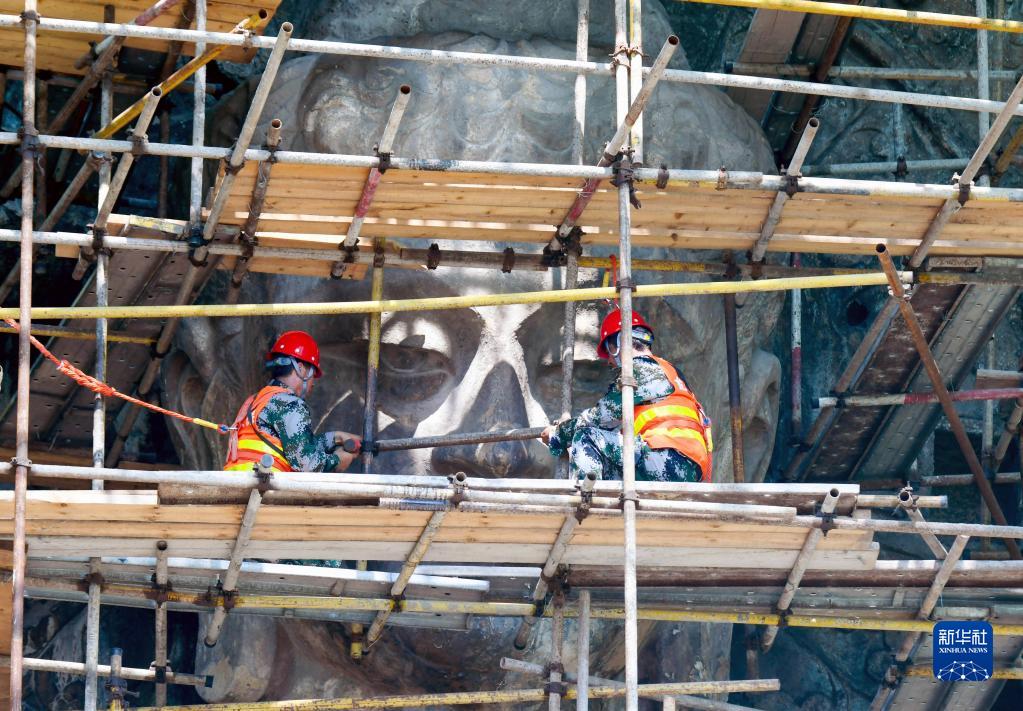 工作人員在洛陽龍門石窟奉先寺拆除腳手架(7月21日攝)。 新華社發(張怡熙 攝)
