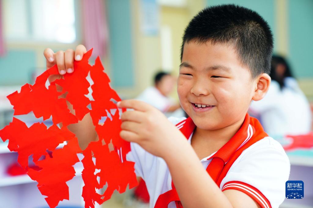 7月28日,在山東省齊河縣祝阿鎮馬坊社區鄉村“復興少年宮”,一名小朋友展示自己的剪紙。