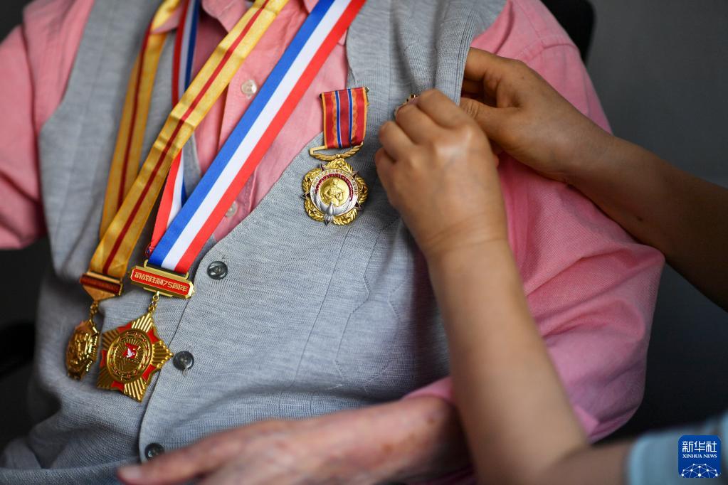 6月13日,在陜西省西安市,抗戰老戰士孫傳聚的女兒為父親佩戴紀念章。