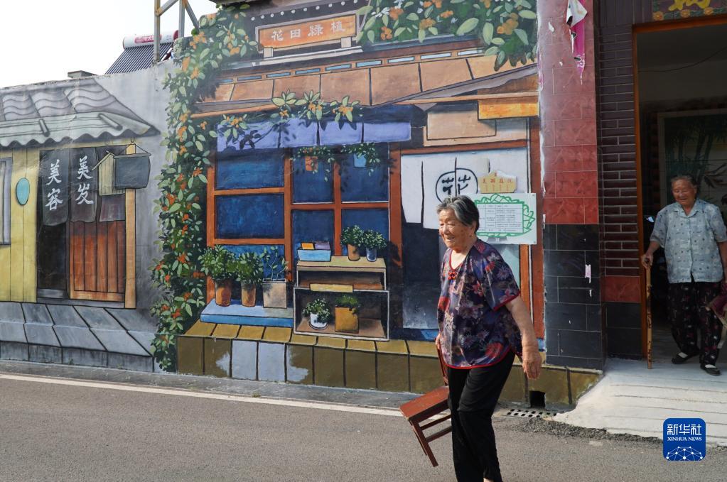 8月3日,北張村村民從墻繪藝術畫前經過。