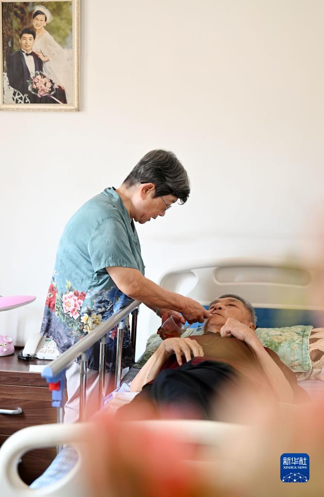 段肇誼(左)給躺在床上的顧偉力喂水(7月22日攝)。
