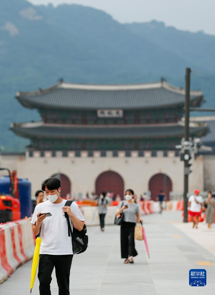 8月3日,行人佩戴口罩走在韓國首爾光化門廣場。