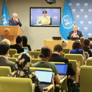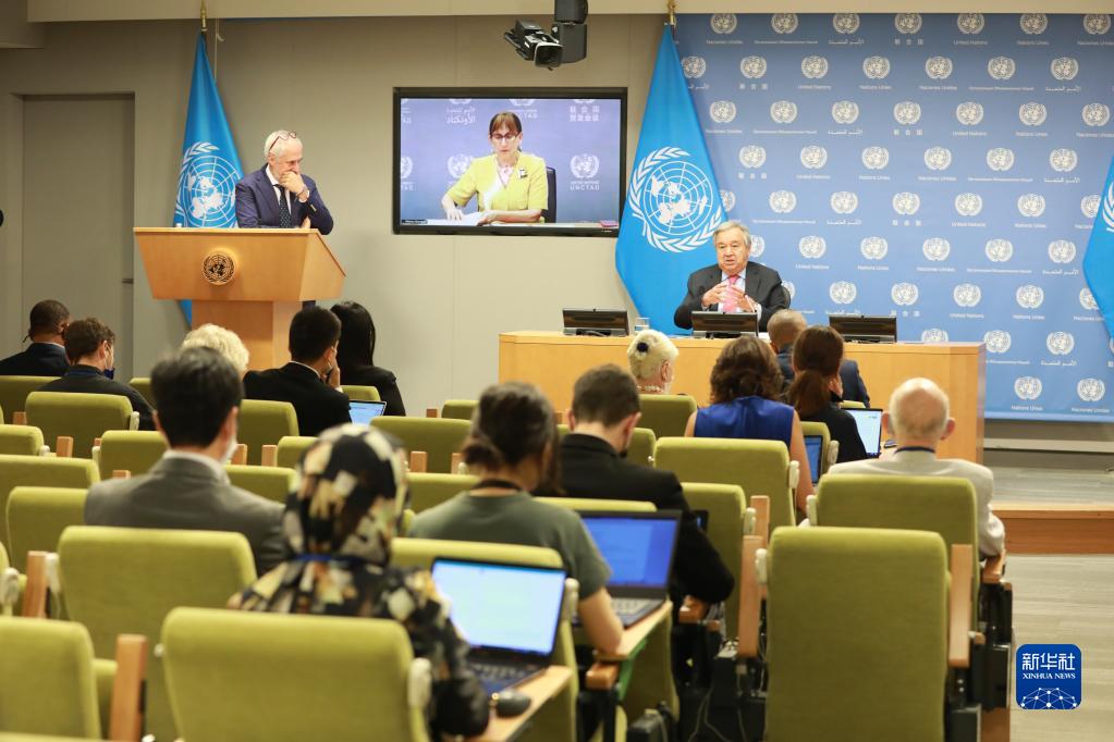 8月3日,在位于紐約的聯合國總部,聯合國秘書長古特雷斯(后右)出席聯合國全球糧食、能源和金融危機應對小組第三次報告發布會。
