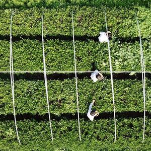 8月3日,在山東省泰安市岱岳區道朗鎮,茶農采摘夏茶(無人機照片)。