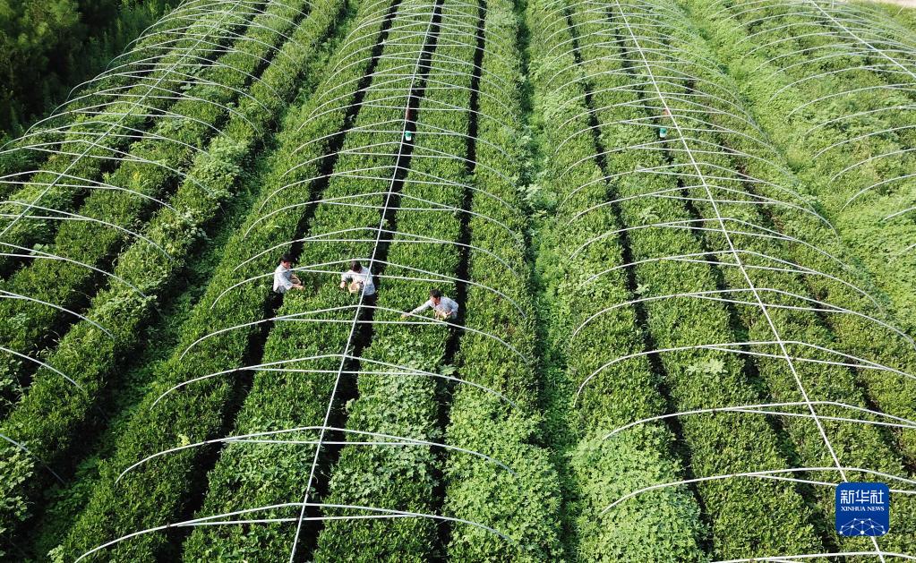 8月3日,在山東省泰安市岱岳區道朗鎮,茶農采摘夏茶(無人機照片)。