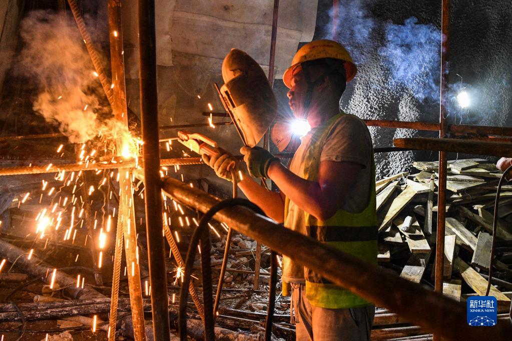 8月3日,在位于廣西環江毛南族自治縣的貴南高鐵大方山隧道內,工人在焊接鋼構件。
