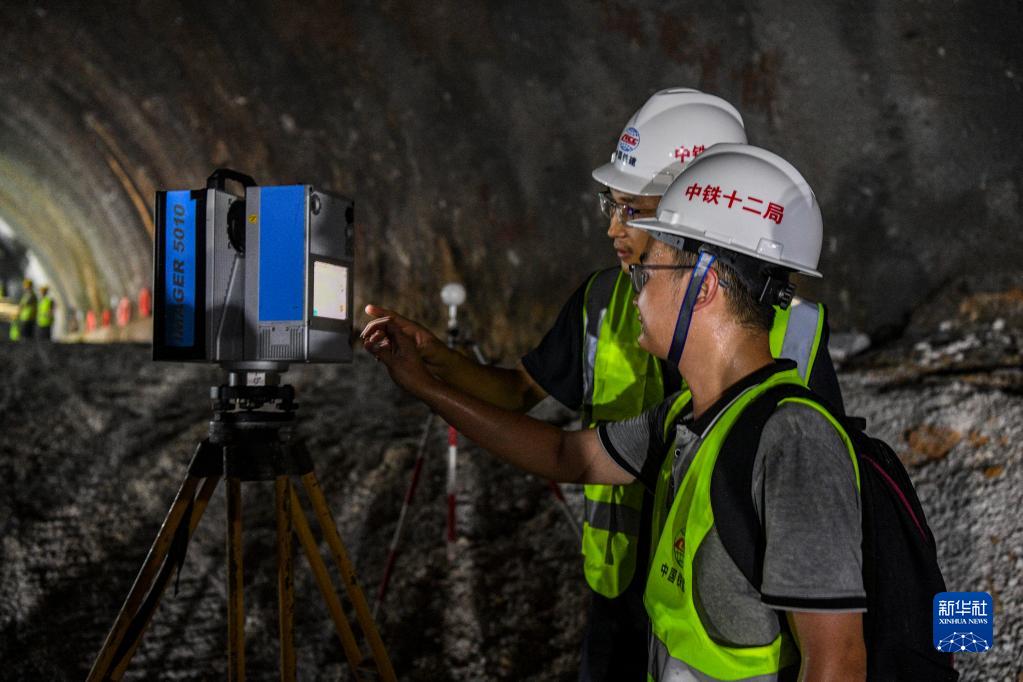 8月3日,在位于廣西環江毛南族自治縣的貴南高鐵大方山隧道內,技術人員在爆破前對隧道內的巖層進行掃描。