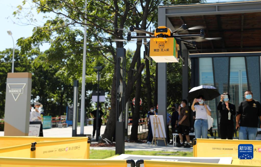 8月4日,一架載有訂單咖啡的無人機在咖啡店門前起飛開始派送。