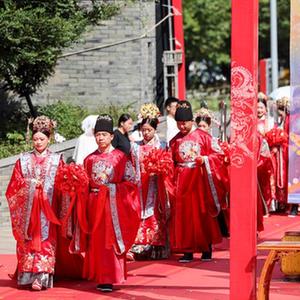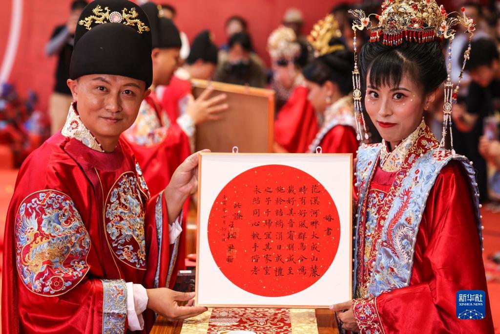 當日是七夕,2022(壬寅)年貴陽孔學堂中華婚禮在貴陽孔學堂舉辦,12對新人身穿中式婚服通過合巹禮、解纓結發、共書婚帖等方式完成傳統婚禮儀式。