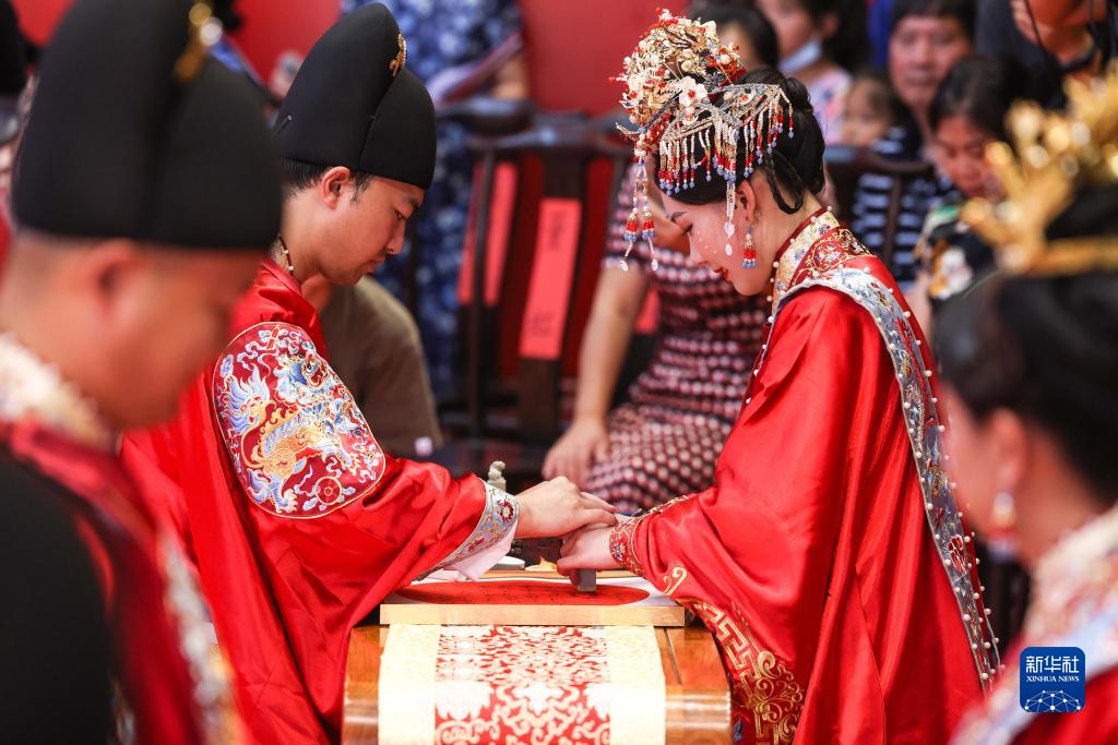 當日是七夕,2022(壬寅)年貴陽孔學堂中華婚禮在貴陽孔學堂舉辦,12對新人身穿中式婚服通過合巹禮、解纓結發、共書婚帖等方式完成傳統婚禮儀式。