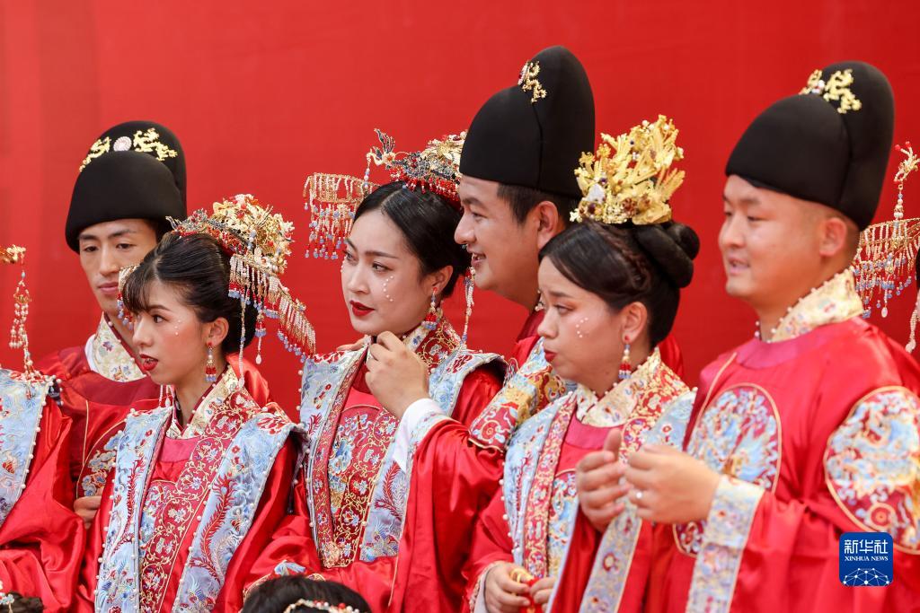 當日是七夕,2022(壬寅)年貴陽孔學堂中華婚禮在貴陽孔學堂舉辦,12對新人身穿中式婚服通過合巹禮、解纓結發、共書婚帖等方式完成傳統婚禮儀式。