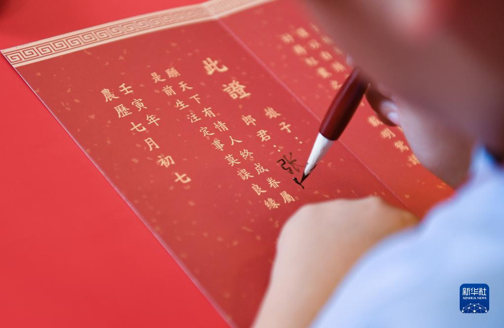 8月4日,游客在“長安十二時辰”主題街區體驗寫“婚書”。