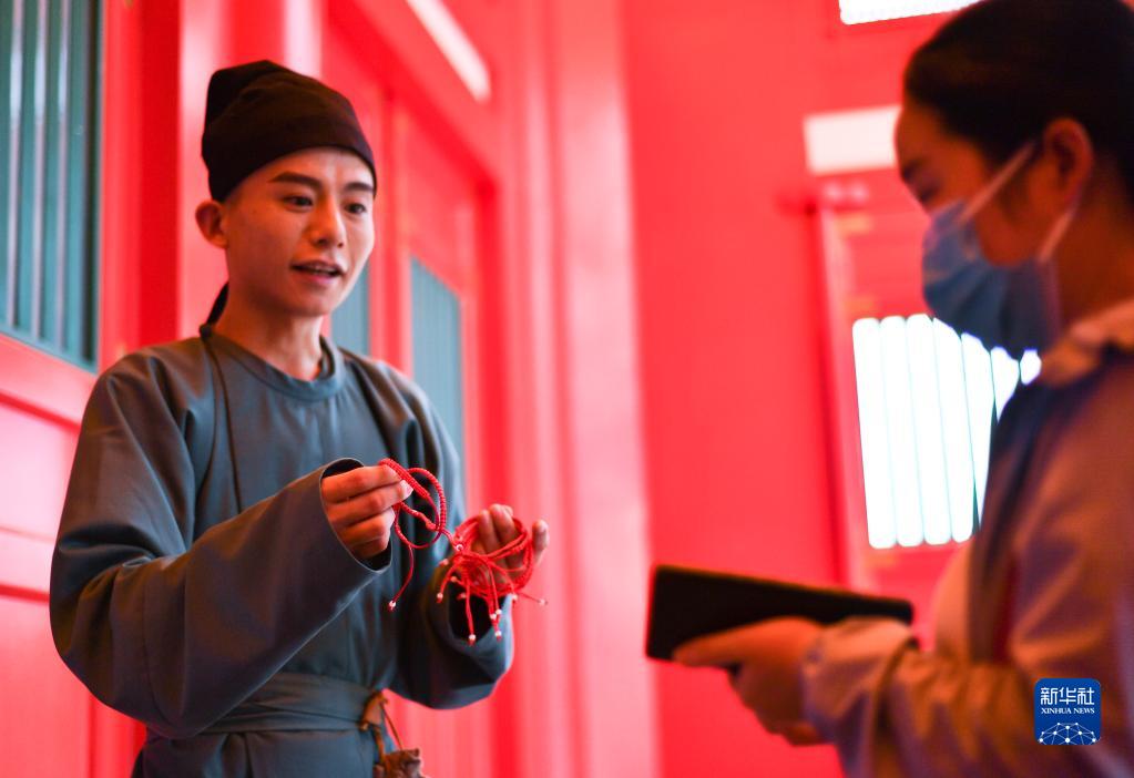 8月4日,演員(左)在“長安十二時辰”主題街區向游客發紅繩。