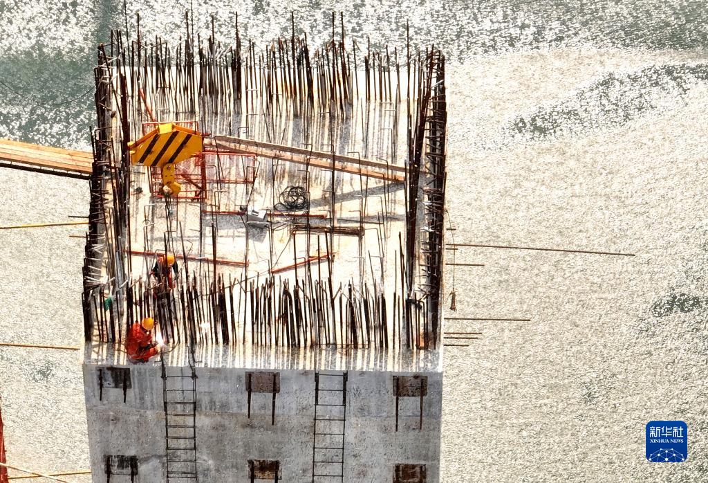 8月3日傍晚,融安至從江高速公路一期工程融水段,工人在橋墩上施工(無人機照片)。