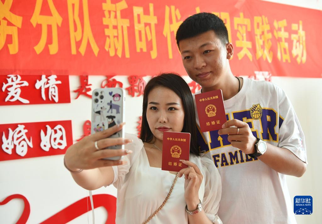 8月4日,在河北省石家莊市欒城區民政局婚姻登記處,一對新人領取結婚證后拍照留念。