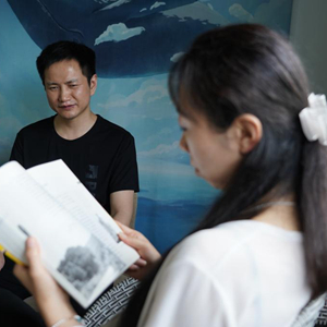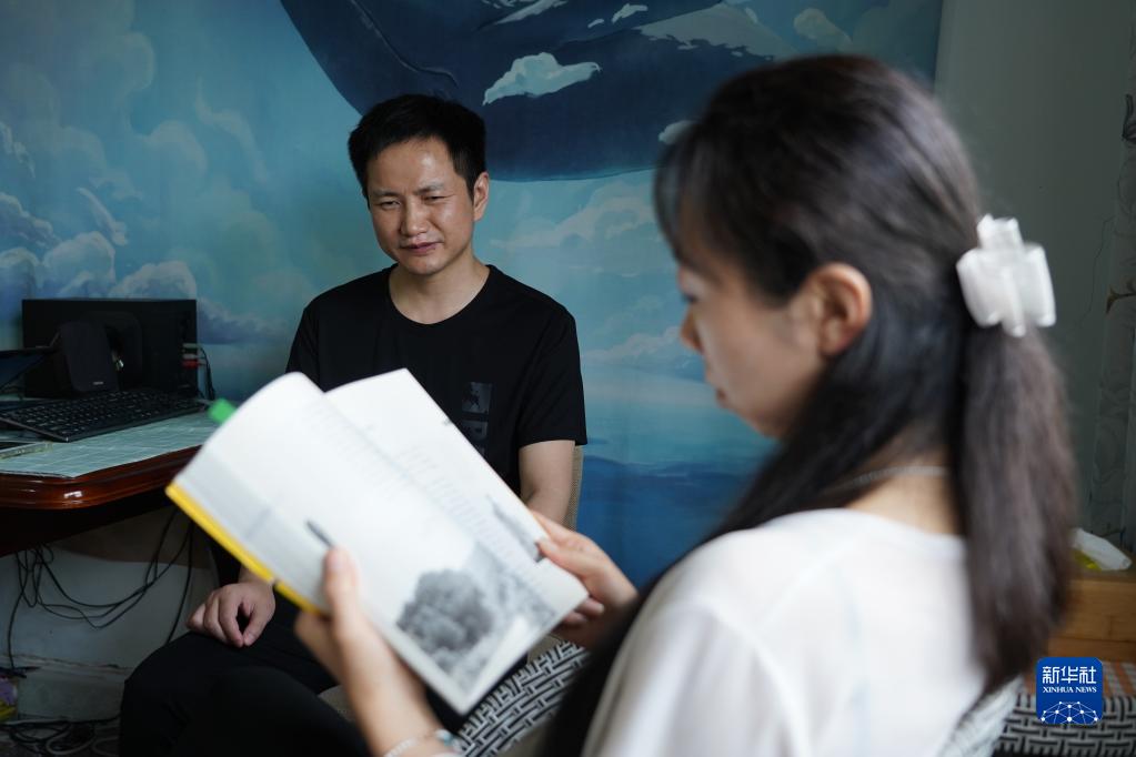 在四川省什邡市馬井鎮同心村,宇曉為王忠禮讀書(8月2日攝)。