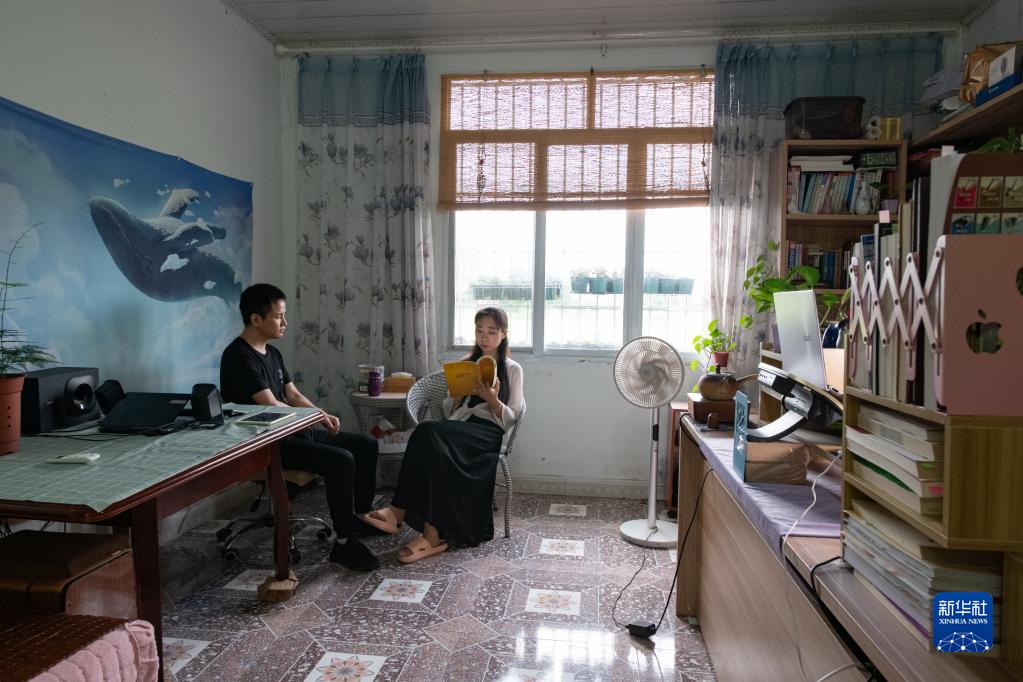 在四川省什邡市馬井鎮同心村,宇曉為王忠禮讀書(8月2日攝)。