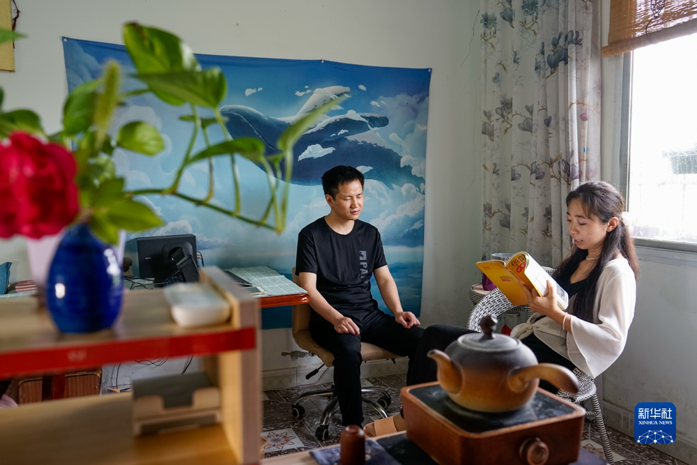 在四川省什邡市馬井鎮同心村,宇曉為王忠禮讀書(8月2日攝)。