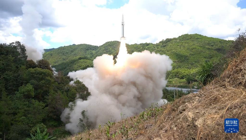 8月4日,東部戰區火箭軍對臺島東部外海預定海域實施火力突擊。這是導彈發射升空(視頻截圖)。