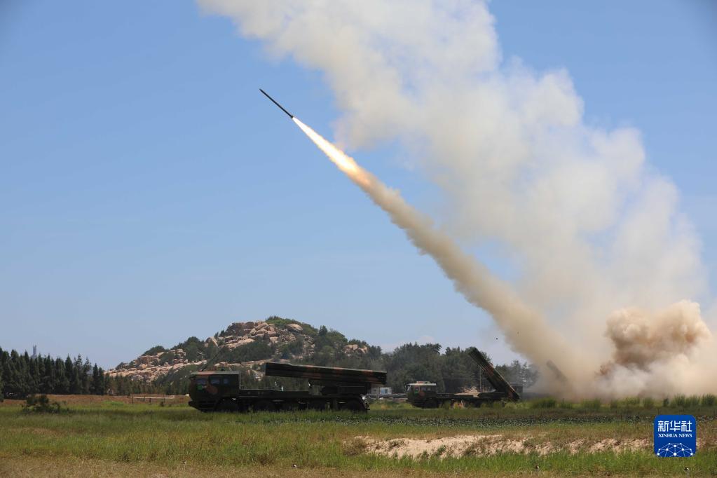 8月4日,東部戰區陸軍某旅組織遠火分隊在臺灣海峽組織實彈射擊,完成精確打擊任務。這是發射現場。