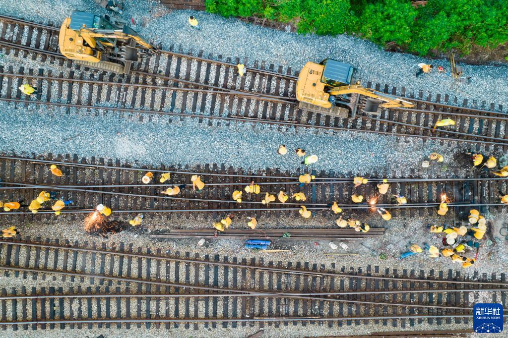 8月5日,在株洲北站編組場,鐵路工人們正在換岔施工(無人機照片)。