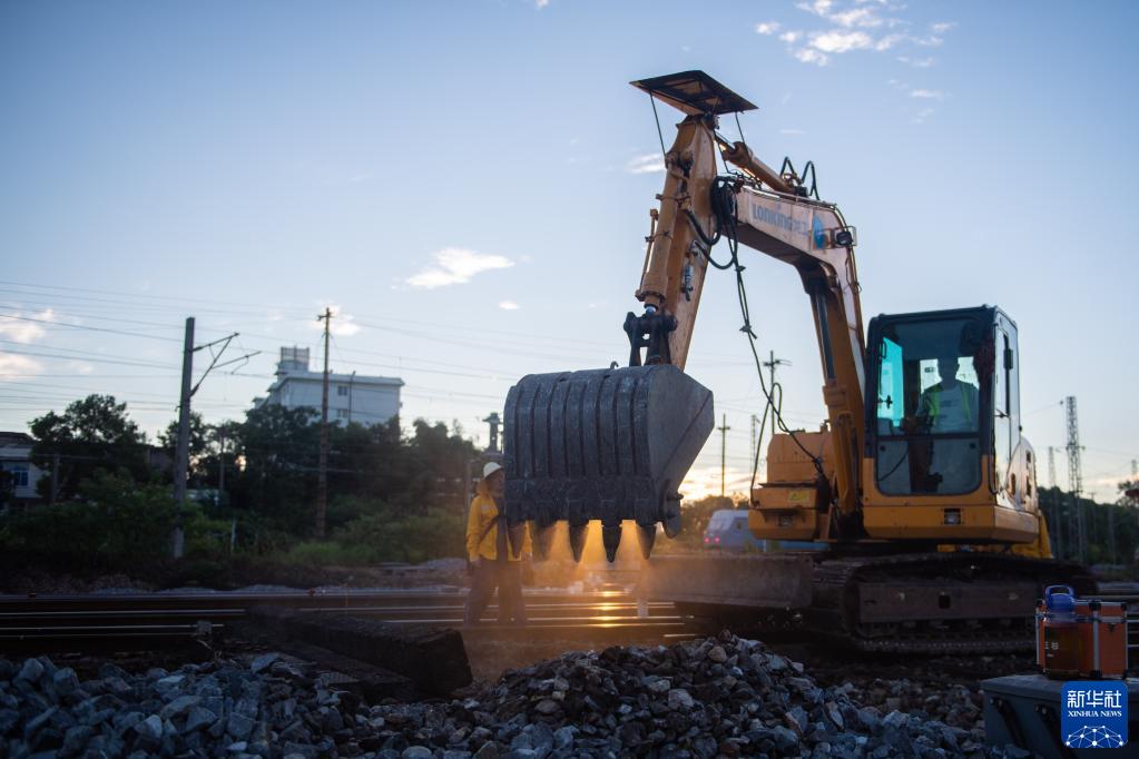 8月5日,在株洲北站編組場,挖掘機正在進行挖掘作業。