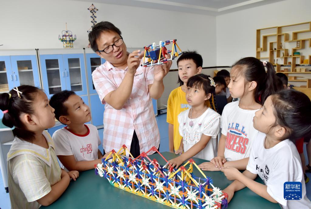 8月5日,河北省邢臺市南和區青少年活動中心老師指導學員進行手工創意搭建。