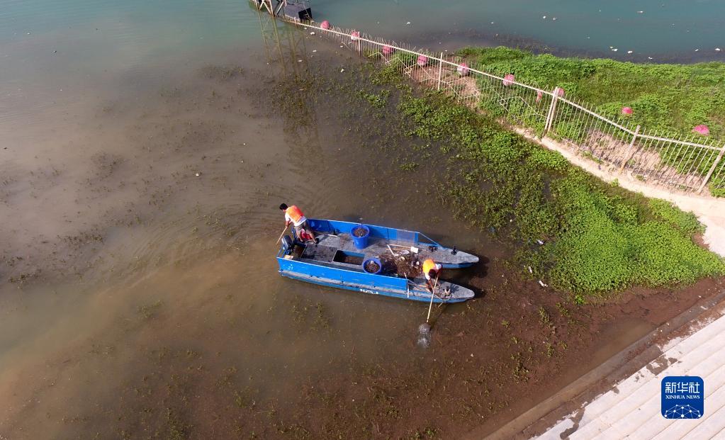 8月5日,劉家峽水庫工作人員駕船在河面上清理漂浮物(無人機照片)。