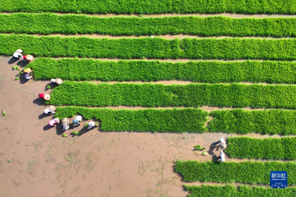 8月5日,在湖南省衡陽市祁東縣歸陽鎮,當地村民在起秧苗(無人機照片)。