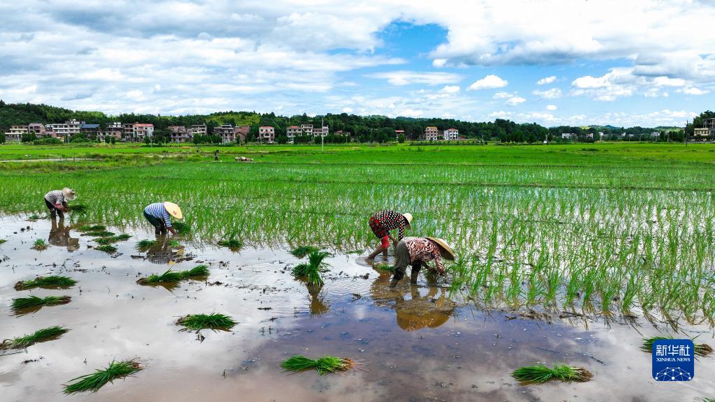 8月5日,在湖南省常寧市勝橋鎮泉峰冠村,農民在搶插晚稻(無人機照片)。