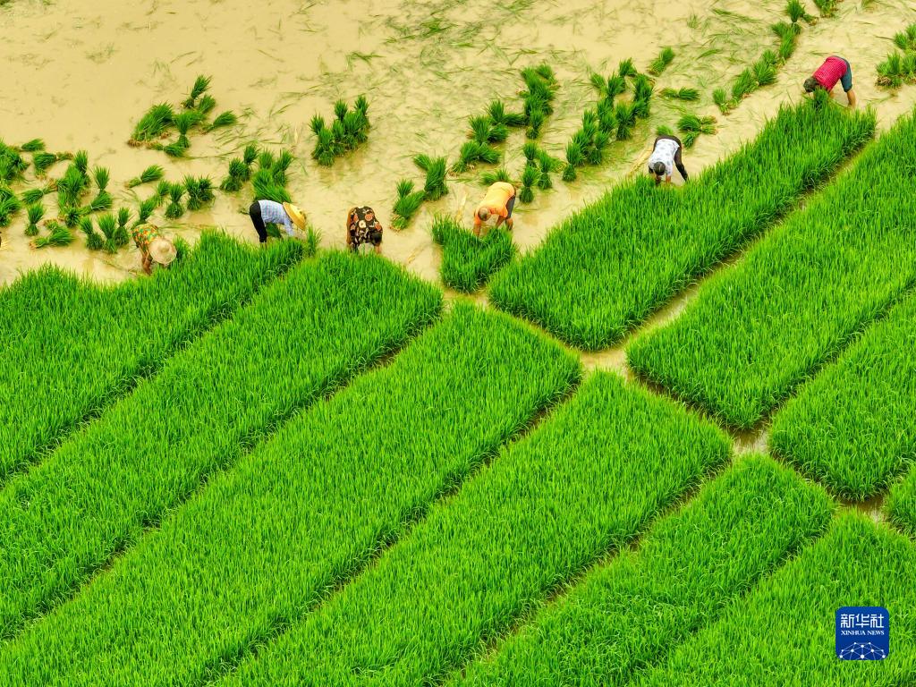 8月5日,在湖南省永州市道縣壽雁鎮玉蟾巖稻作文化園,農民在起獲晚稻秧苗(無人機照片)。