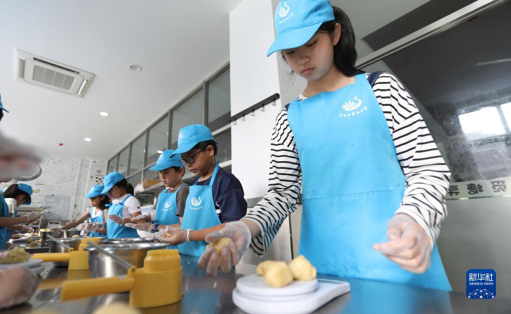 8月4日,在遼寧省沈陽市渾南區第九小學,參加暑期托管班的學生學習做月餅。